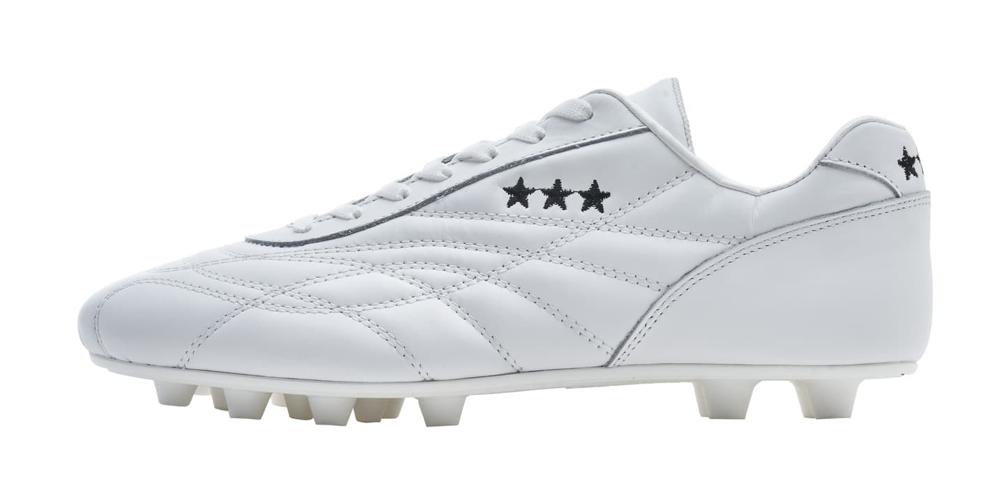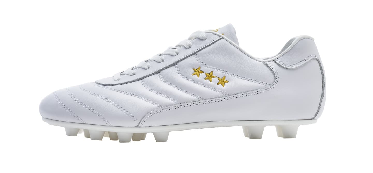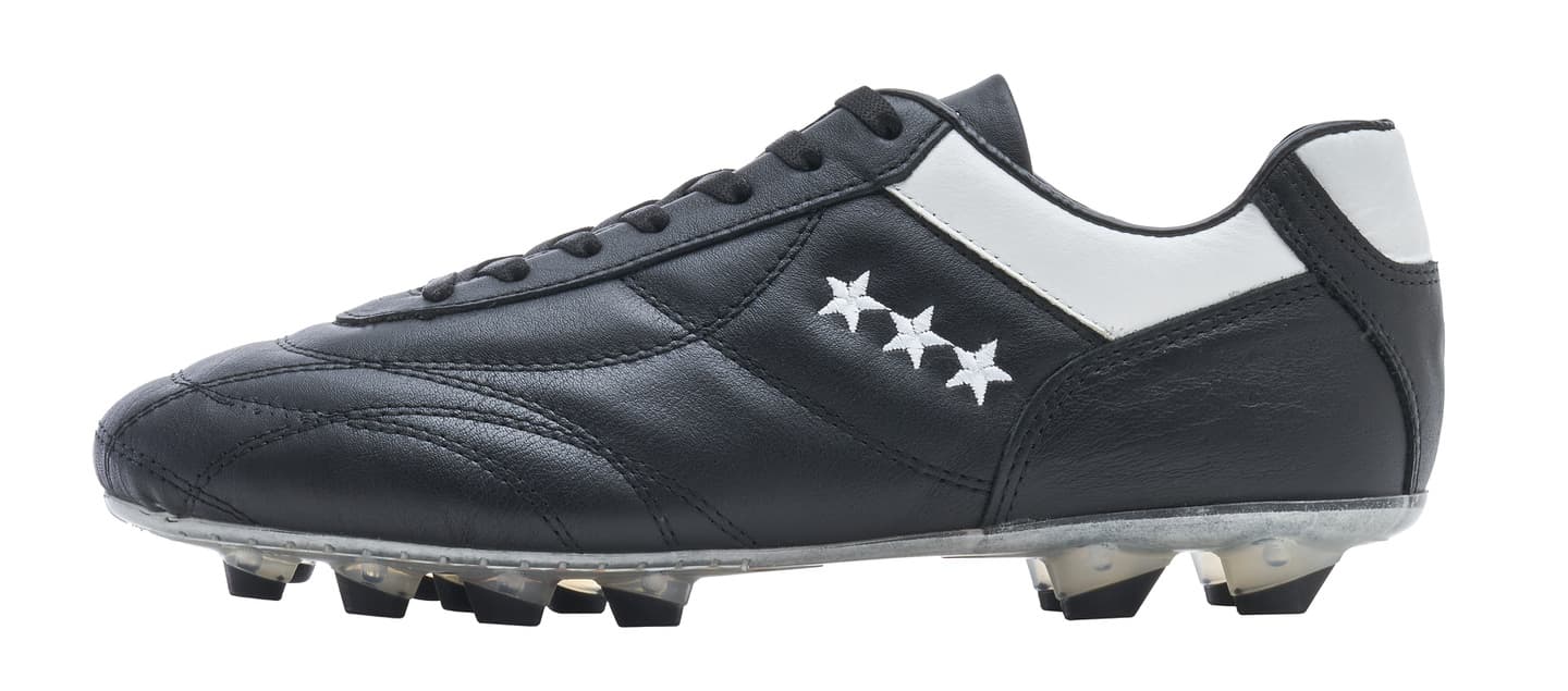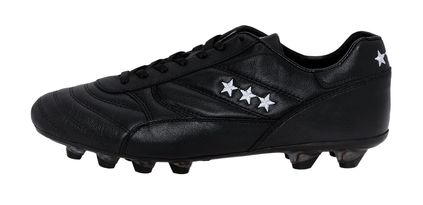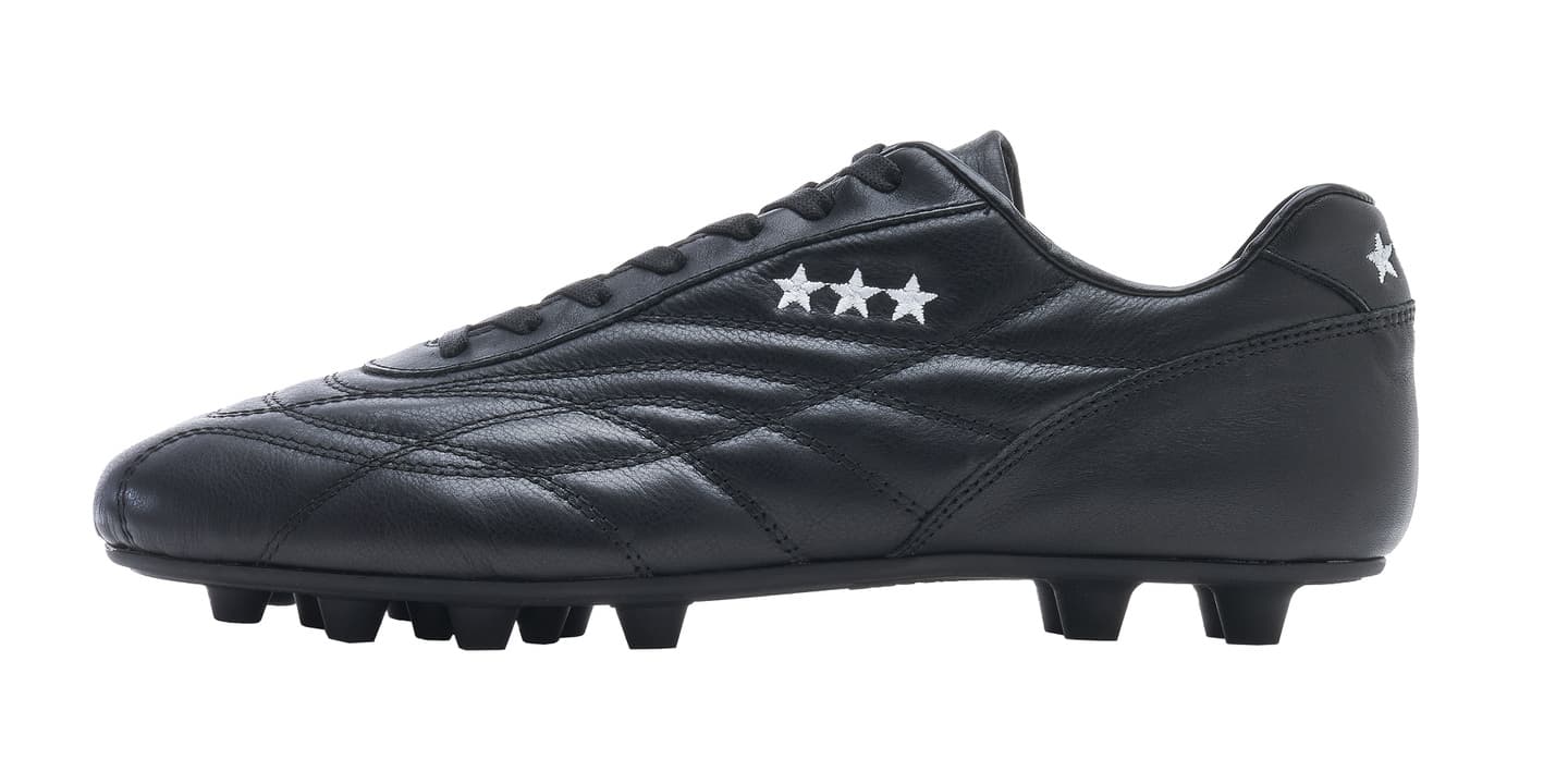 カンガルーレザーを使用し試合でも最初から最後まで快適な履き心地を実現。マッケイ製法を採用し耐久性に優れブランドを象徴する★★★模様がアッパーに手縫いで施されエレガントなデザインを表現。ポリウレタンソールで固い地面にも対応可能で左右のデザインが異なるのも特徴的。