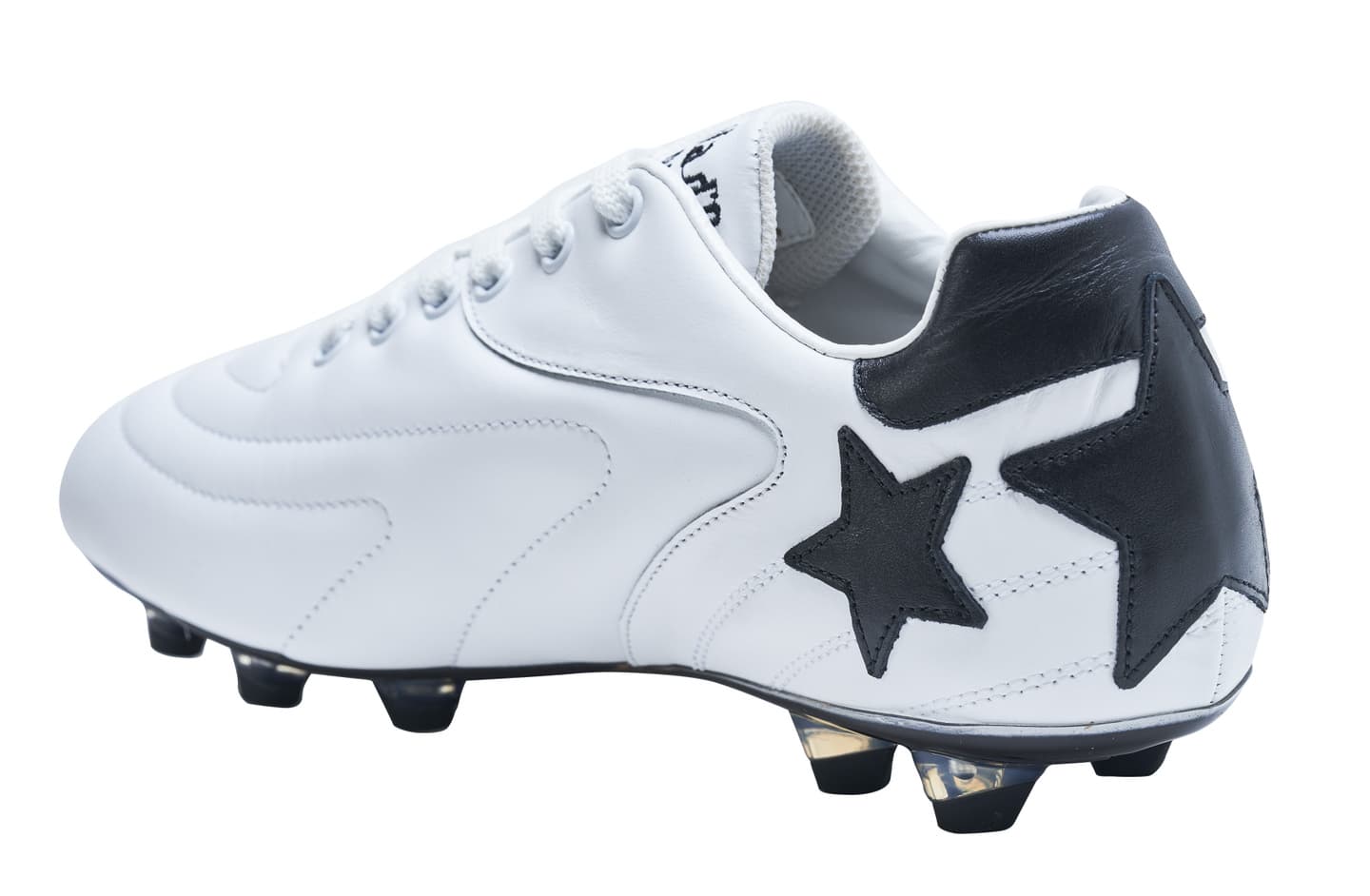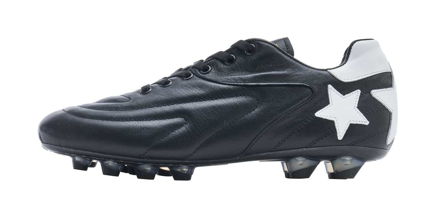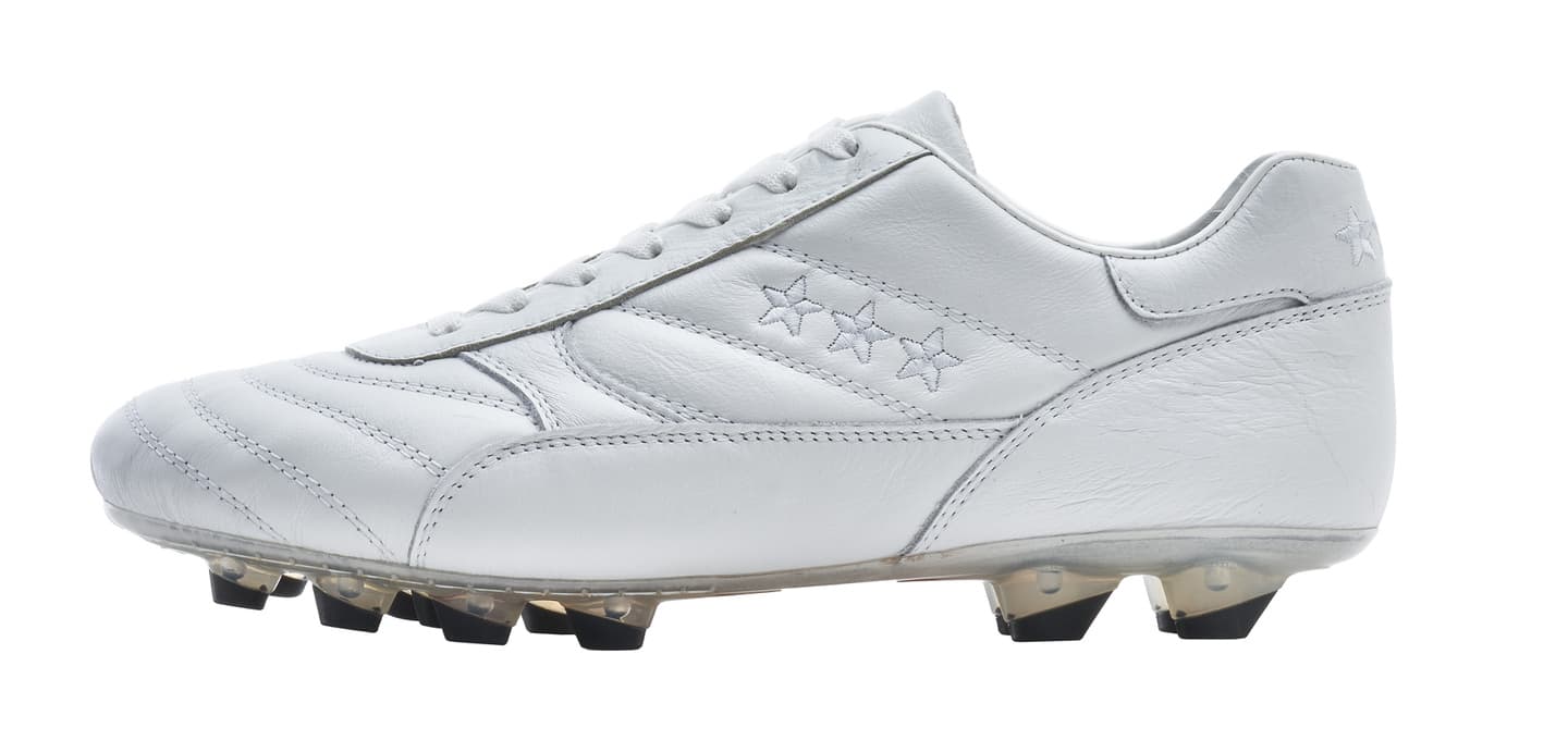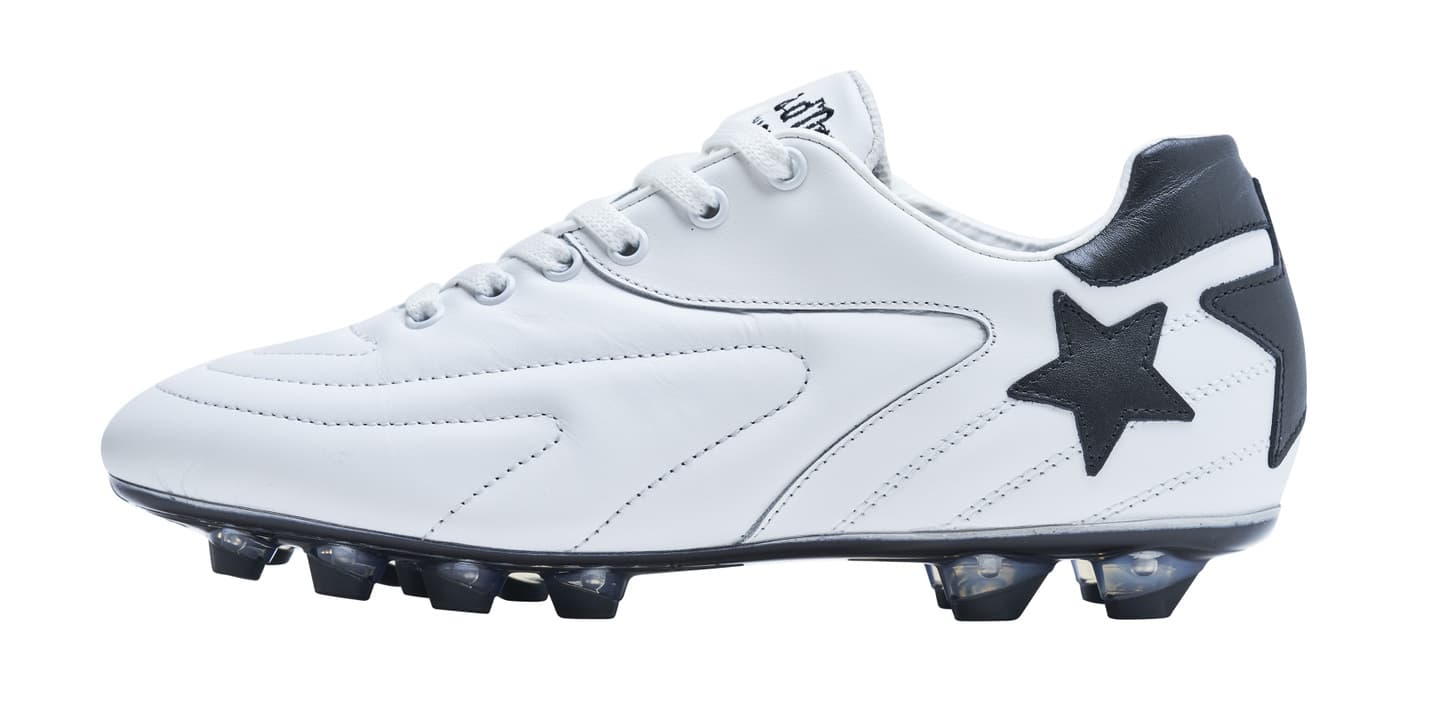 カンガルーレザーを使用し試合でも最初から最後まで快適な履き心地を実現。マッケイ製法を採用し耐久性に優れブランドを象徴する★★★模様がアッパーに手縫いで施されエレガントなデザインを表現。ポリウレタンソールで固い地面にも対応可能で左右のデザインが異なるのも特徴的。
